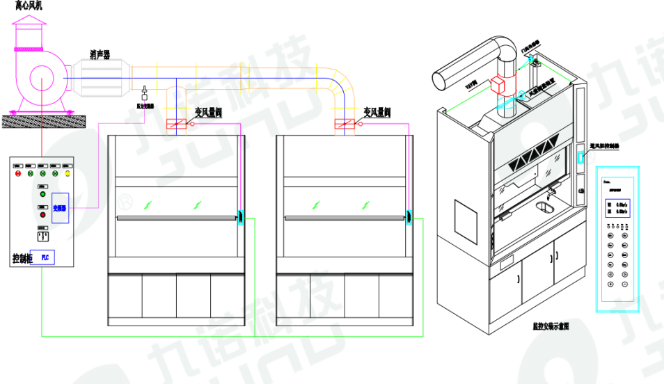 控制方法:系统按所有需求风量设计;在通风柜上安装变风量阀,于调节门移动过程中保持通风柜的面风速为常量,控制阀门的开度,采用定管道静压闭环控制变频器输出频率,控制风机运行的转速,以满足通风柜设定面风速所需风量,达到通风柜面风速恒定的控制效果